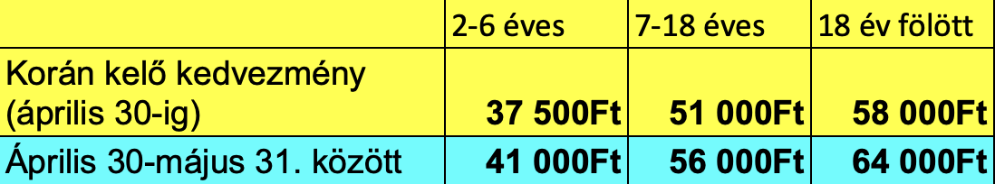 FONTOS! A tábori jelentkezésed csak az előleg beérkezése után válik érvényessé. Idén is van „korán kelő” kedvezmény. Amennyiben április 30-ig jelentkezel, a kedvezményes ár vonatkozik rád. Ha április 30. és május 31. között jelentkezel, a „teljes ár” vonatkozik rád. Ezt az alábbi táblázatban is láthatod.
