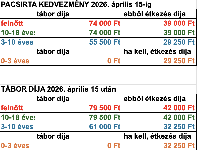 FONTOS! A tábori jelentkezésed csak az előleg beérkezése után válik érvényessé. Idén is van „korán kelő” kedvezmény. Amennyiben április 15-ig jelentkezel, a kedvezményes ár vonatkozik rád. Ha április 15. és május 31. között jelentkezel, a „teljes ár” vonatkozik rád. Ezt az alábbi táblázatban is láthatod.
